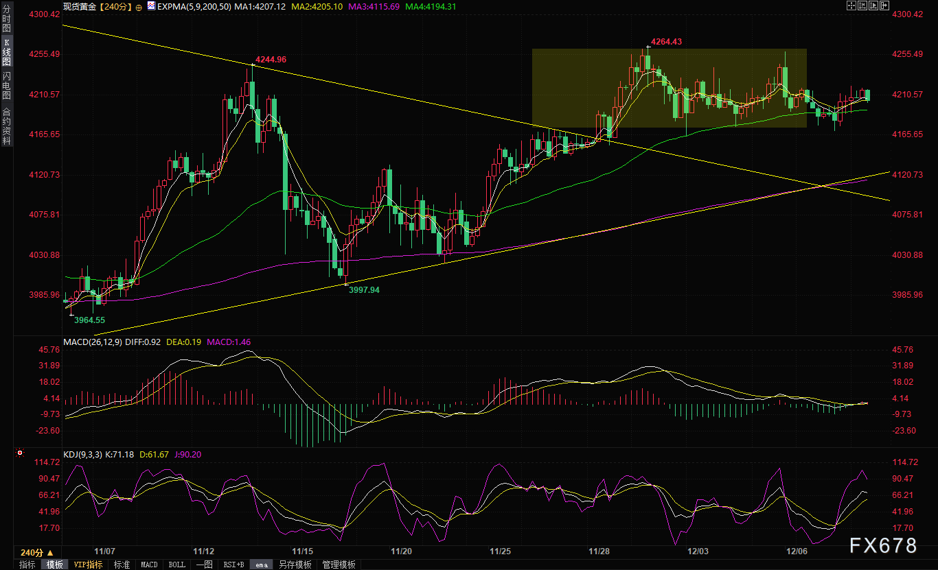 汇通财经APP讯——周三(12月10日)亚洲时段,现货黄金窄幅震荡,目前守在4200关口上方,交投于4205美元/盎司附近,但缺乏后续买盘跟进。市场越来越接受美联储将在今日结束的两日政策会议后降息25个基点,这一预期未能帮助美元延续近期从10月底以来低点的反弹。这反过来成为支撑无息资产——黄金的主要因素。