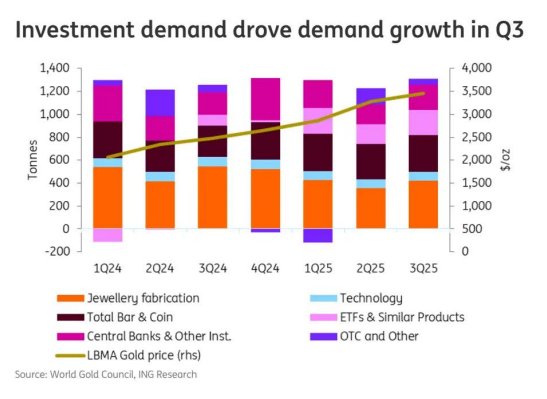 ING银行发布经济金融分析报告指出,受央行强劲需求、宏观经济不确定性及资产配置策略调整等多重因素驱动,黄金在2025年实现创纪录上涨,且这一牛市行情有望在2026年持续,预计全年黄金均价将达到每盎司4325美元。