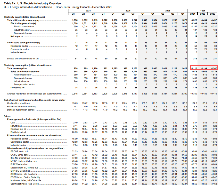 美东时间12月9日,美国能源信息署(EIA)发布短期能源展望报告显示,美国2025年和2026年电力消耗将创历史新高。EIA预计,2025年电力需求将提升至4199亿千瓦时,2026年达到4267亿千瓦时,高于2024年创纪录的4110亿千瓦时。