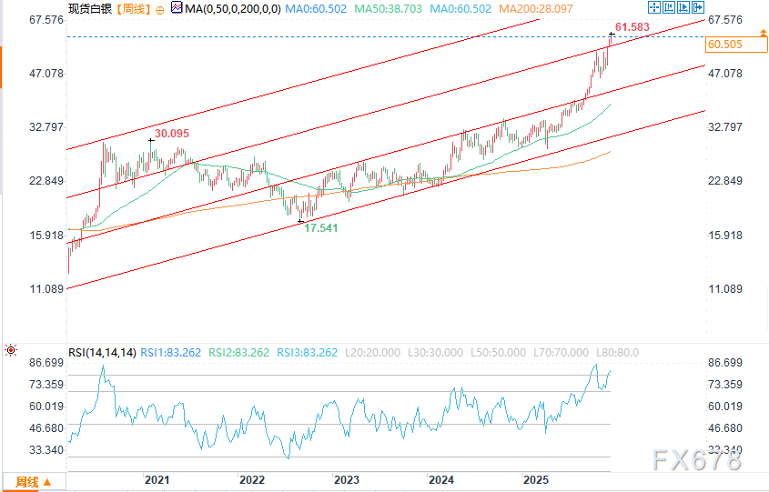 下行风险:若白银价格回落至第二个上升通道的上轨下方(即跌破57美元),则可能触发回调走势,前期阻力位或将转化为支撑位,回调目标依次看向55美元、50美元,极端情况下可能下探45美元,之后牛市趋势才有望重启。
