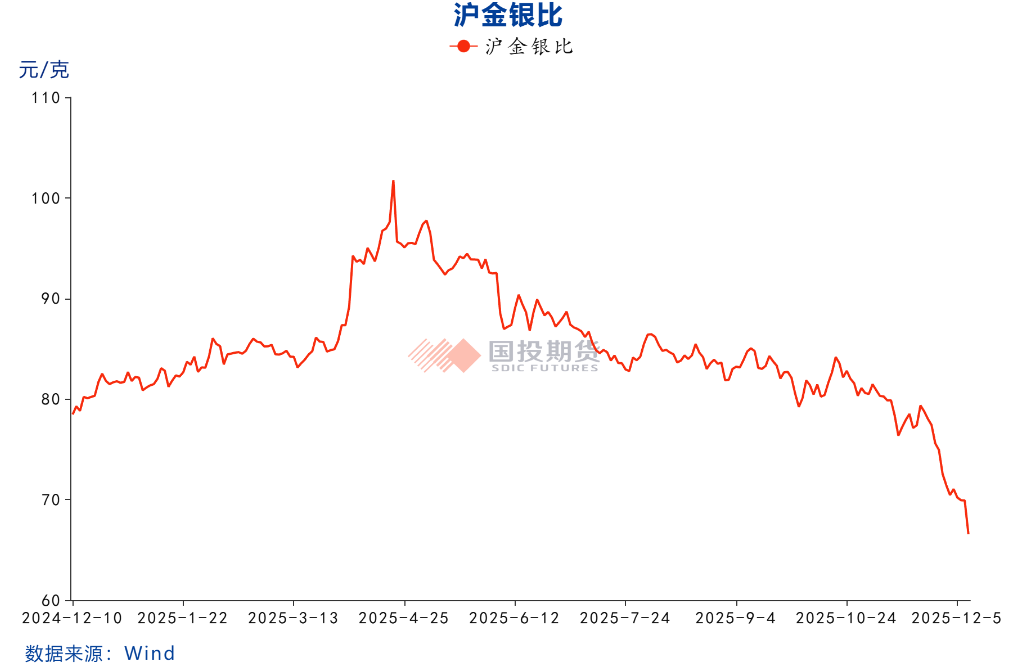2025年12月10日,白银期现货价格再创历史新高,国内站上14300元每公斤,Comex白银再破60美元每盎司大关。与此同时引人注目的一点是,内外黄金价格几乎一动不动,仍然维持在此前的950元每克的水平上,白银本轮价格的异动为明显的独立行情,其价格驱动从上半年的跟随金价,逐步切换到下半年的金银比驱动,金银比从4月最高的100以上目前已经跌破70,也就是说,同期白银相对于黄金的超额涨幅已经超过30%。