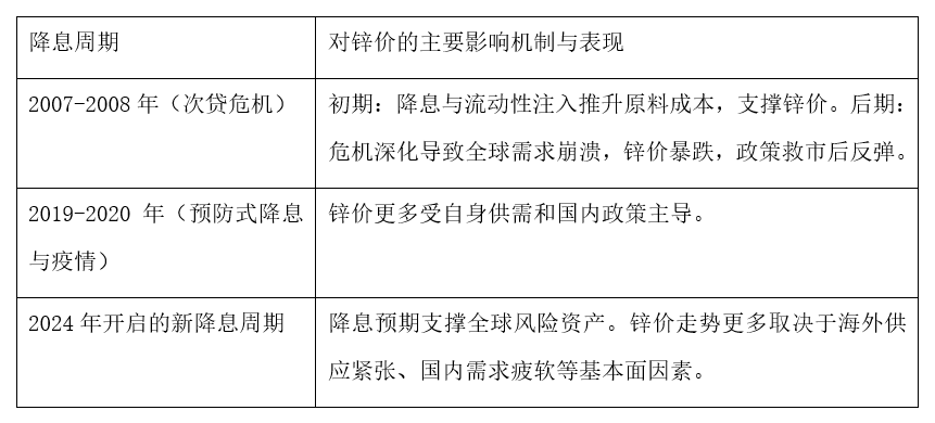 表3:2007年以来主要降息周期中影响锌价的核心因素