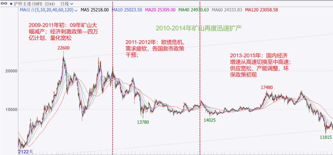 2009年至2015年是锌价在政策刺激与基本面弱势之间反复博弈的时期,整体呈现出震荡下行的特征。这一周期可根据价格走势进一步划分为三个小阶段。