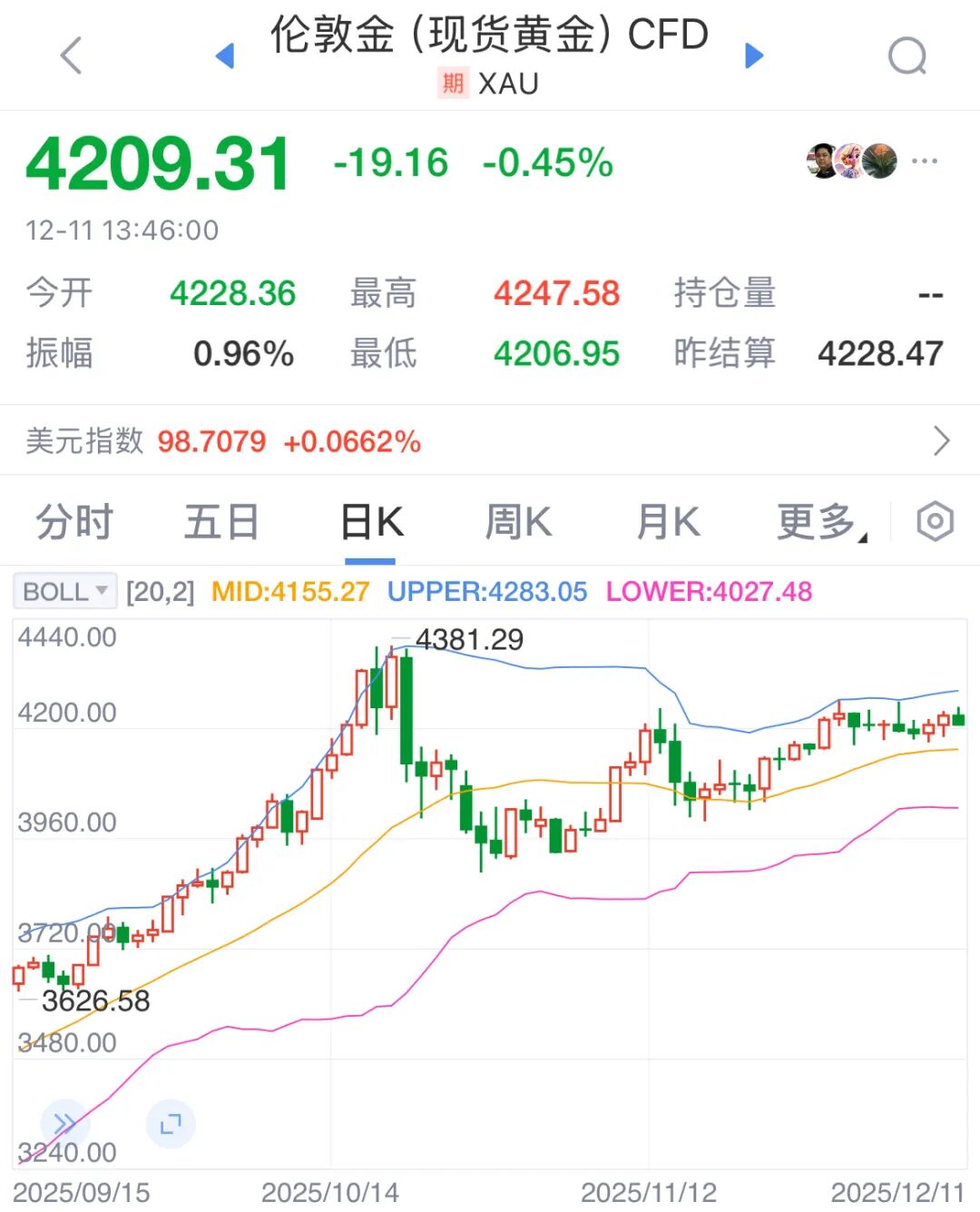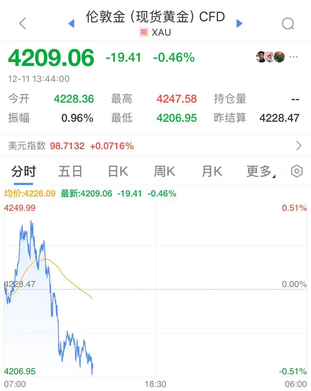 12月11日亚洲早盘国际金价一度走高,现货黄金站上4240美元/盎司,盘中突然跳水转为下跌,截至发稿,现货黄金报4209美元/盎司。纽约期金也回落收窄涨幅。