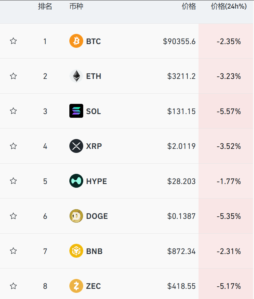 美股指数期货也下跌,截至发稿,标普500指数期货跌幅扩大至1%,纳斯达克100指数期货下跌1.5%。虚拟货币也集体下跌,比特币一度跌破9万美元大关,其余主要币种全线大幅走弱,截至发稿,比特币跌超2%,以太坊跌超3%。过去24小时加密货币市场超15万人爆仓。