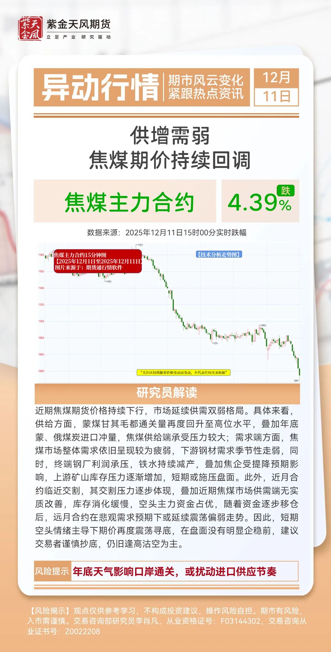 【12月11日异动行情】供增需弱焦煤期价持续回调