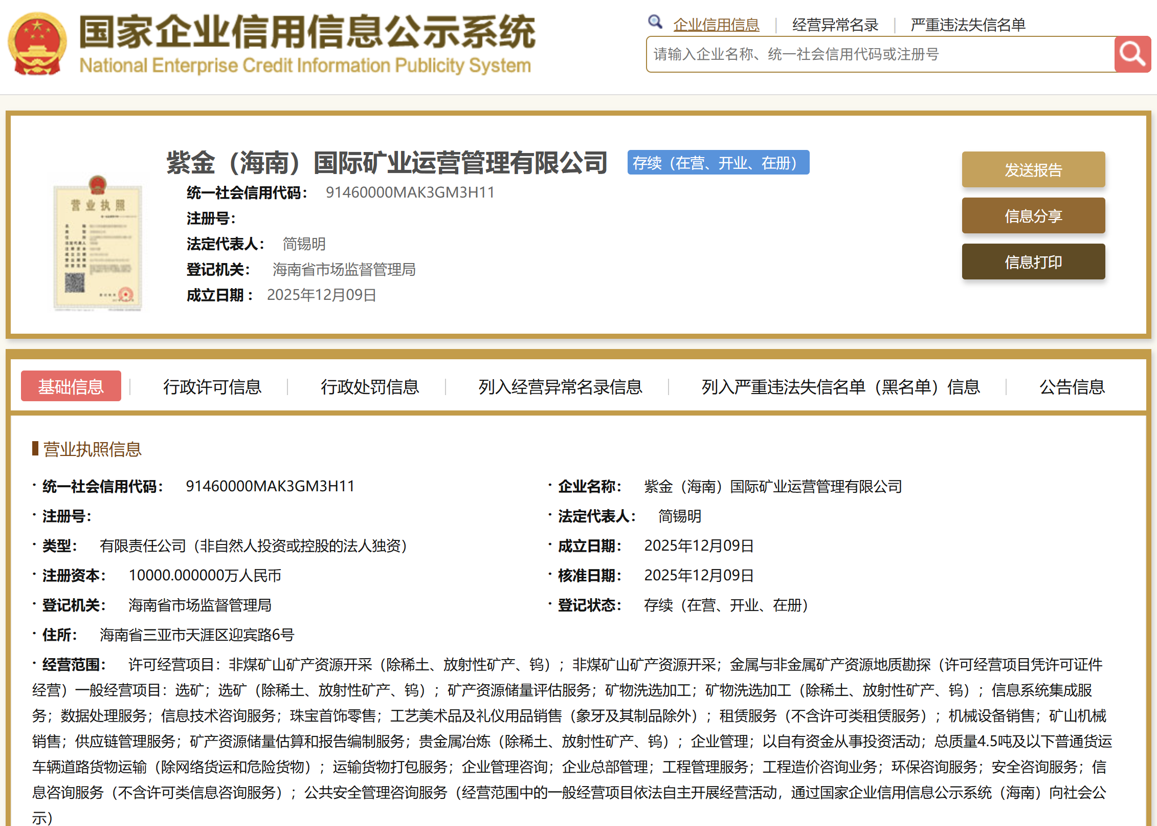 国家企业信用信息公示系统显示,紫金(海南)国际矿业运营管理有限公司于12月9日成立,注册资本1亿元人民币,经营范围包含非煤矿山矿产资源开采、金属与非金属矿产资源地质勘探、矿产资源储量估算和报告编制服务等。股权穿透显示,该公司由紫金矿业集团股份有限公司全资持股。