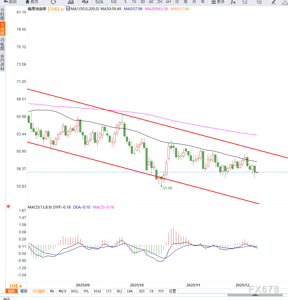从技术层面来看,WTI 原油的价格走势同样呈现出疲弱格局。经过长达数周的震荡整理之后,油价最终跌破先前维持的58至63 美元区间下沿,使短期趋势由横盘转为偏弱。
