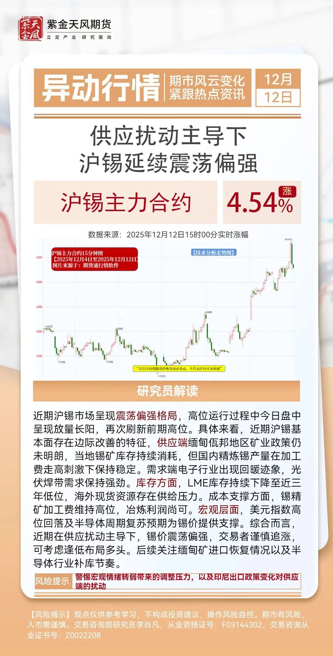 【12月12日异动行情】供应扰动主导下沪锡延续震荡偏强