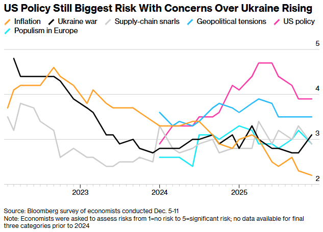 美国的政策——无论是货币政策还是贸易政策——仍被视为对欧元区最严重的威胁,而俄乌冲突也仍然是一个重大关切。
