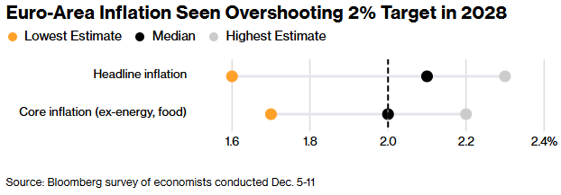 然后,注意力将转向2028年——这将是该年份首次出现在预测中。调查显示预测值将略高于欧洲央行2%的目标,使得近三分之二的分析师更担心中期目标被突破,而非不及目标。