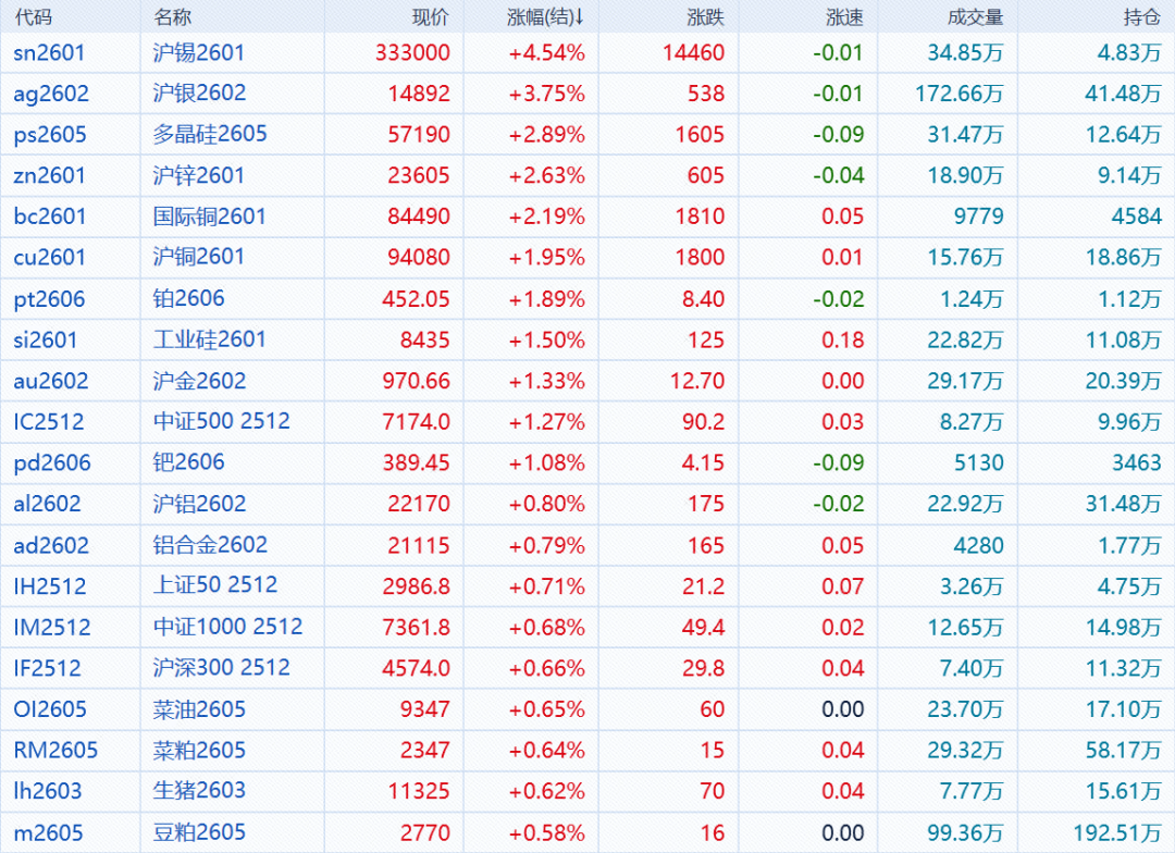 沪深300股指期货(IF)主力合约涨0.68%,上证50股指期货(IH)主力合约涨0.71%,中证500股指期货(IC)主力合约涨1.27%,中证1000股指期货(IM)主力合约涨0.68%。