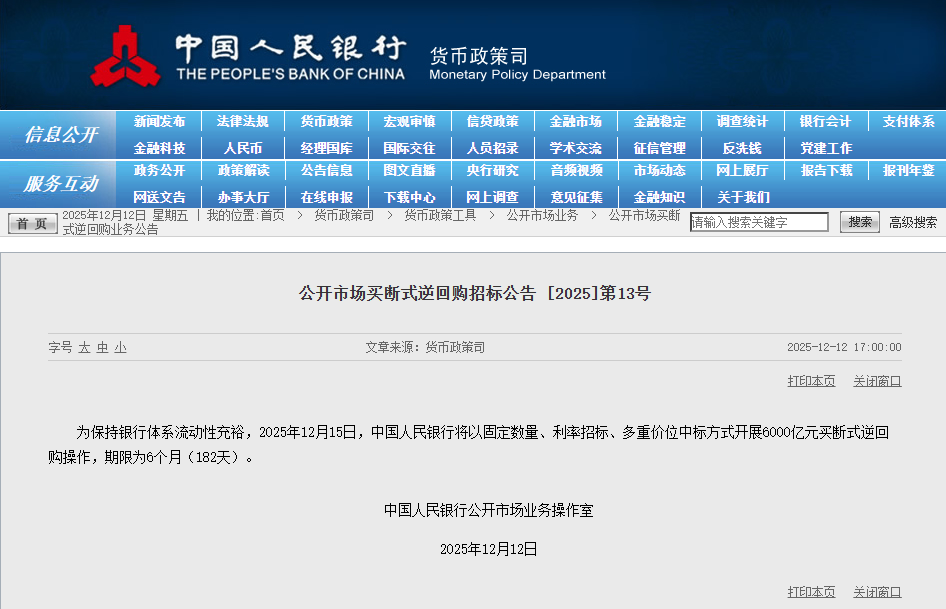 12月12日,据中国人民银行官网消息,为保持银行体系流动性充裕,2025年12月15日,中国人民银行将以固定数量、利率招标、多重价位中标方式开展6000亿元买断式逆回购操作,期限为6个月(182天)。