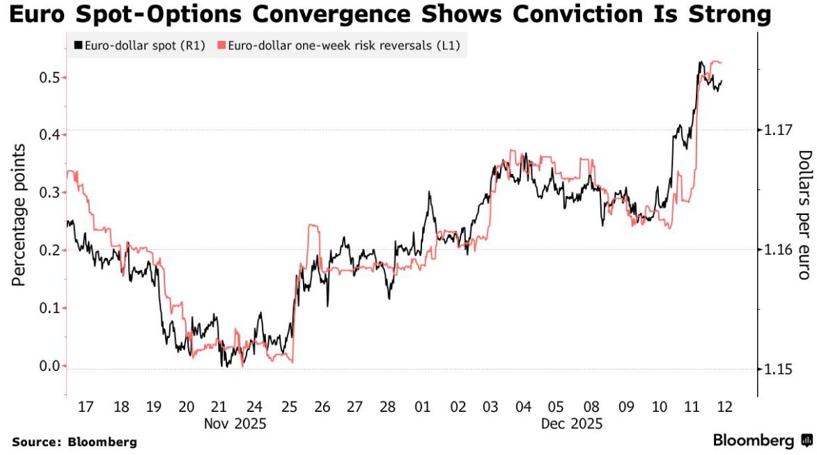据存款信托和清算公司(DTCC)的统计数据显示,本月交易最活跃的行权价位于每欧元 1.18 美元,其中基础价值的绝大部分集中在 12 月 18 日至 19 日(欧洲央行利率决议窗口期)到期的合约。这些资金流向表明,到决策者完成会议时,欧元汇率将交投于该水平之上。