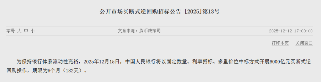 中国人民银行12月12日消息,为保持银行体系流动性充裕,12月15日,中国人民银行将以固定数量、利率招标、多重价位中标方式开展6000亿元买断式逆回购操作,期限为6个月(182天)。