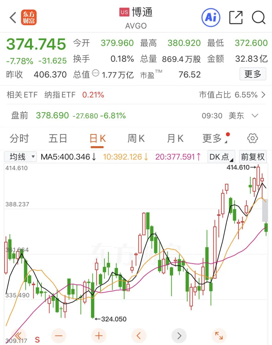 盘面上,博通股价大跌令科技股承压。截至发稿,博通跌近8%,总市值为1.77万亿美元。
