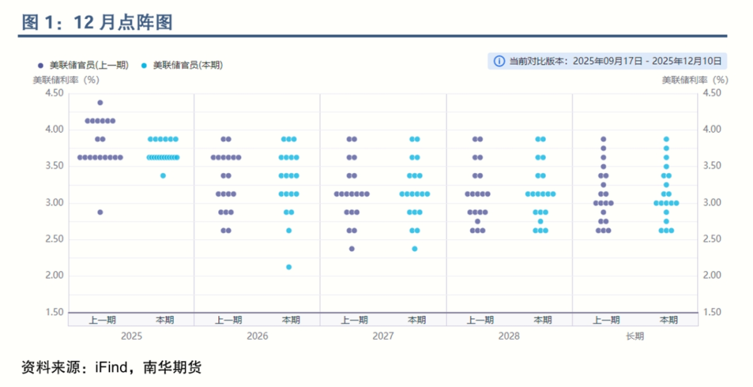 从票型来看,明年FFR终点水平的中位数依旧在3.25%-3.5%,而27年中位数与9月一样维持在3%-3.25%,总体来说延续了26、27年各一次降息的预测,这意味着整个降息节奏是平缓的。