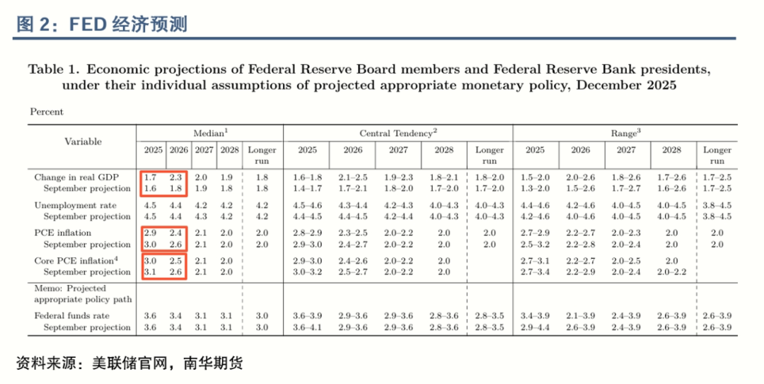 2)点阵图整体跟9月相近,指向明、后年各一次降息,利率长期下行的路径平稳。经济预测方面,经济走强、通胀走低、就业市场稳定,描绘出较为乐观的宏观环境。具体来看,本次会议上调今明两年的经济预测,26年实际GDP增速大幅预测大幅上调0.5pct,此外下调了今明两年的通胀预测,失业率预测水平与9月持平。结合QA来看,经济强劲来源于AI对投资的提振以及支持性财政政策对消费的支撑。