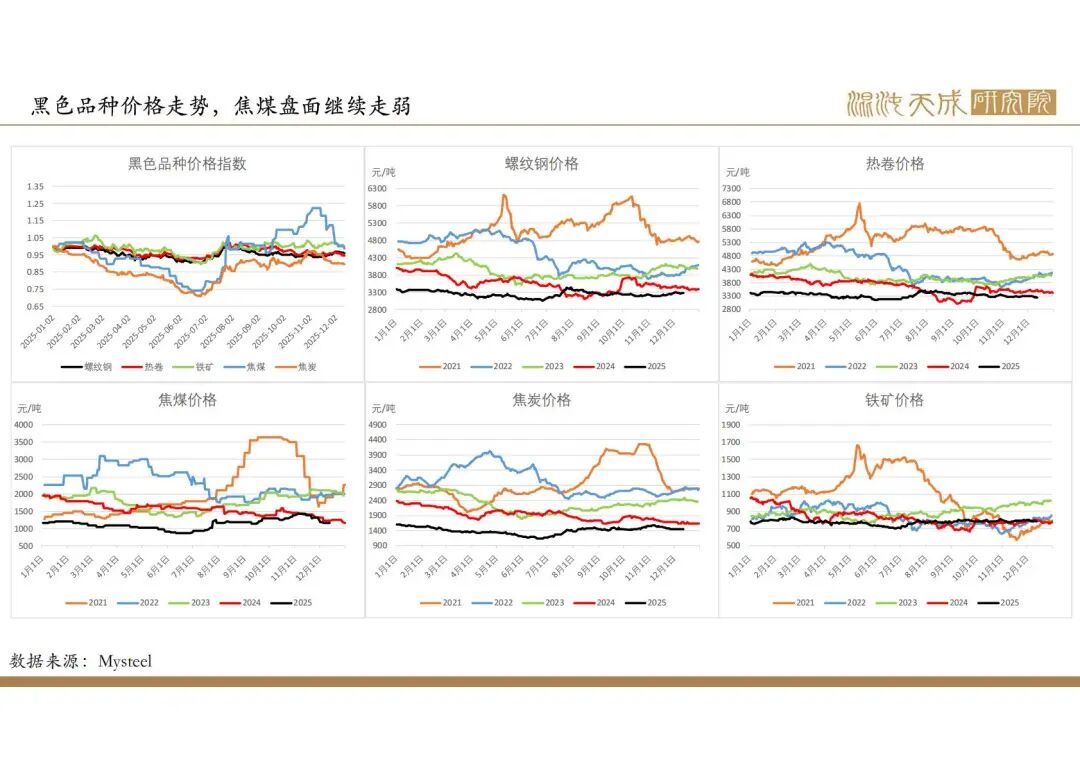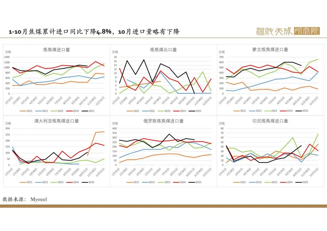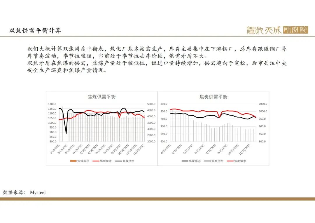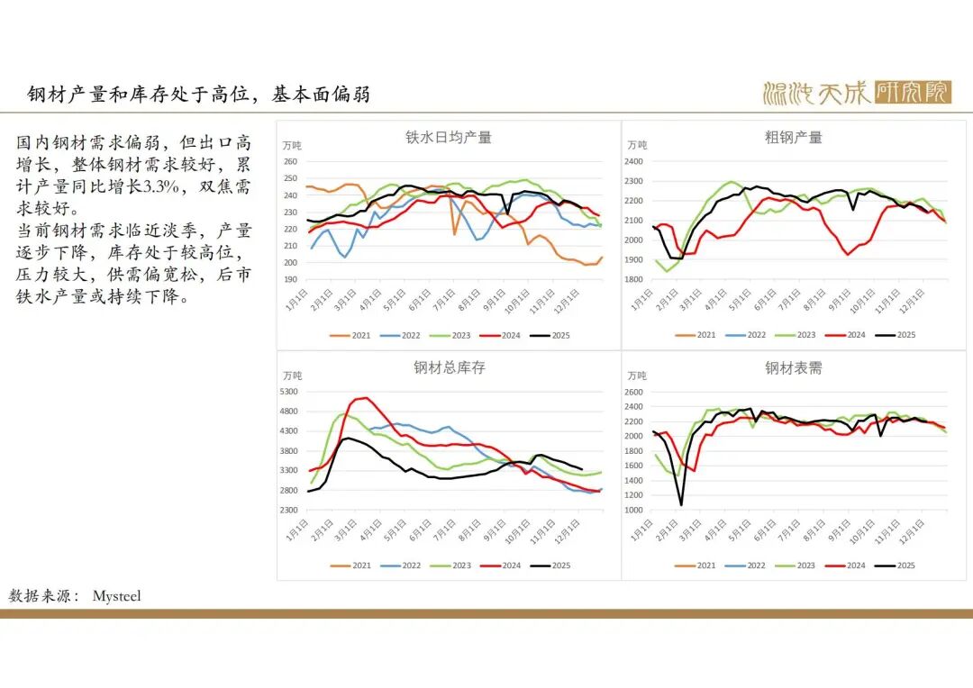2025年政府政策主线在于化债和促消费,国内建筑业需求偏弱,但出口增速较高,钢材整体需求较好,但钢材产量和库存处于较高位,企业利润下降,后市有一定减产预期。焦煤产量低位运行,进口量持续增加,供需趋向于宽松。