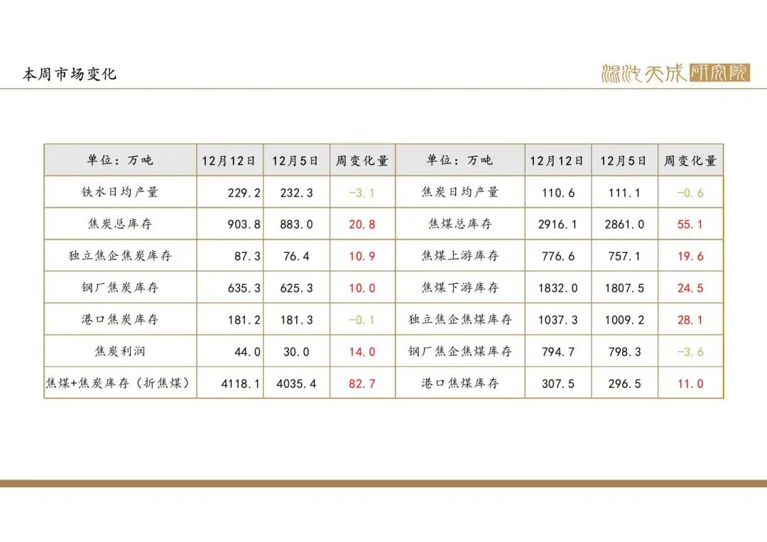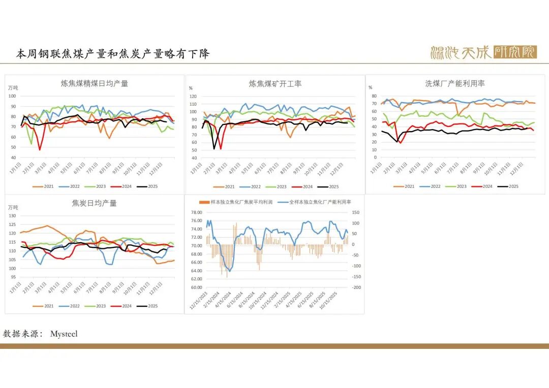 本周钢联焦煤日均产量75万吨,环比-0.5%,同比-6.6%。汾渭焦煤产量略下降,同比-6%左右。焦炭日均产量110.6万吨,环比-0.5%,同比-2.6%,焦炭有一定利润,第二轮提降落地。