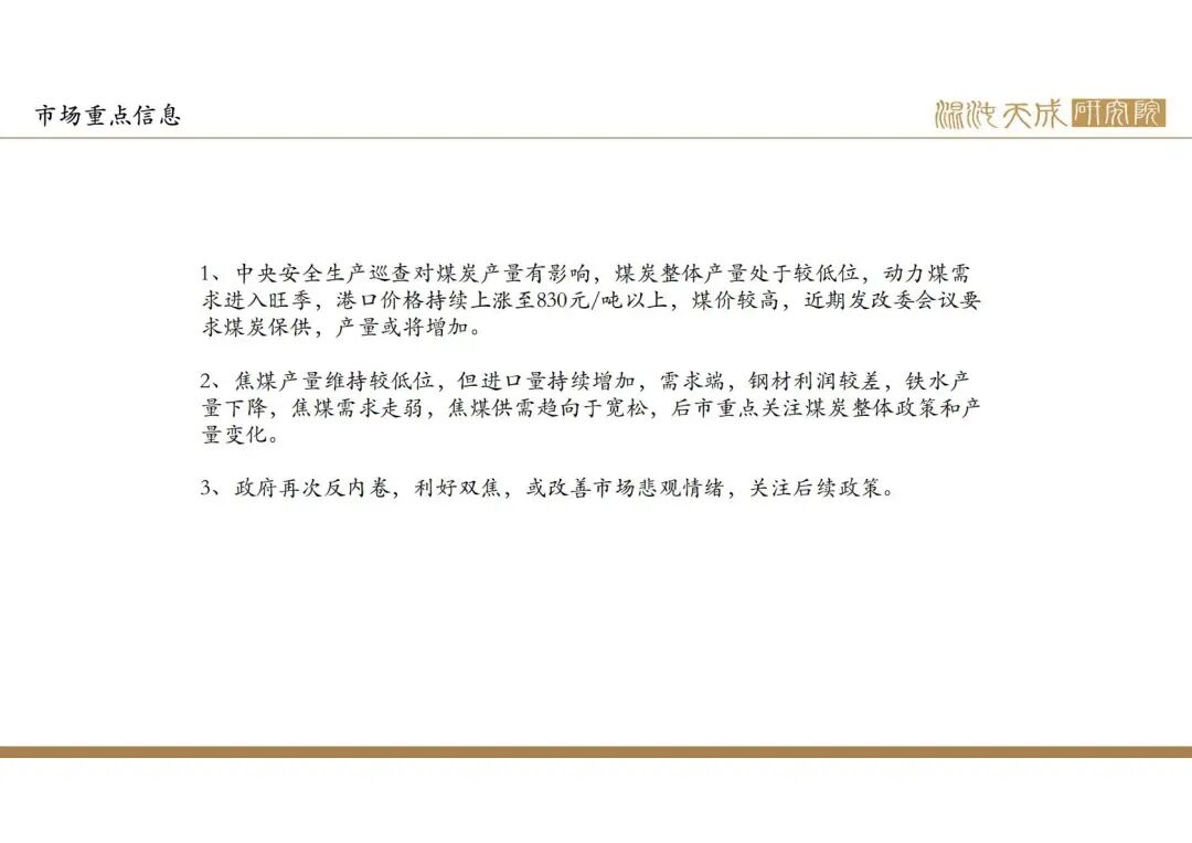 当前矛盾:中央安全生产巡查工作正在进行,煤炭产量持续受到影响,动力煤和焦煤产量维持较低位,但进口量增加,动力煤港口价格继续回落,仍未到边界。煤价仍是政策主导,政府更倾向于煤价稳定,我们预期动力煤价格合理区间在700-800元/吨,焦煤区间可能在1100-1400元/吨。当前焦煤产量维持低位,但进口量持续增加,供需趋向于宽松,焦煤主力合约已跌至1100元/吨以下,价格在边界,近日政府再提反内卷,后续可能有相关政策,利好煤炭预期,并且双焦有一定冬储预期,拐点或临近,建议逢低买入。