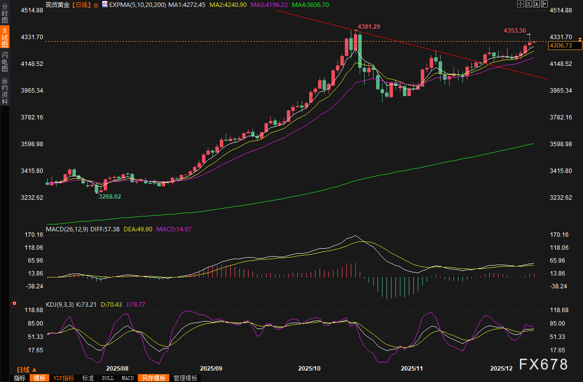 汇通财经APP讯——上周五(12月12日)金价表现出色,现货黄金上涨0.48%,收报每盎司4300美元附近,盘中最高触及4353美元/盎司,这是自10月21日以来的最高水平。美国期金也收涨0.4%,结算价达到4328.3美元。这种上涨势头让黄金多头信心满满,尤其是在美联储上周第三次降息25个基点后,市场对宽松货币政策的预期进一步升温。