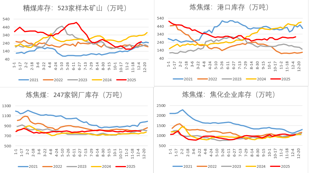 在下游采购节奏放缓的背景下,上游矿山库存从十一月中开始出现库存拐点,从去库转为累库,近期精煤库存累库呈现加速的趋势。中游流通环节成为累库核心,国内110家洗煤厂库存环比增长3.2%,北方主要港口焦煤库存连续四周回升至286万吨,其中蒙煤占比超60%,港口堆存能力已接近警戒水平,部分贸易商被迫降价抛货。下游需求端虽暂未大幅累库,但焦化厂和钢厂的焦煤库存可用天数在逐步回升,钢厂采购节奏明显放缓。