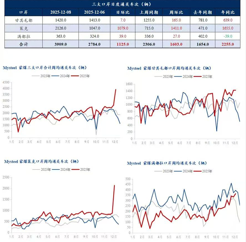 进口煤方面,此前支撑焦煤价格反弹的进口收缩逻辑,在年底通关放量中彻底逆转。数据显示,蒙煤主要通关口岸甘其毛都、策克近期保持高位运行,12月8日策克口岸单日过货量达31.79万吨,创下历史新高。1-11月蒙煤进口量同比增长18%,其中11月单月进口量突破120万吨,远超市场预期。