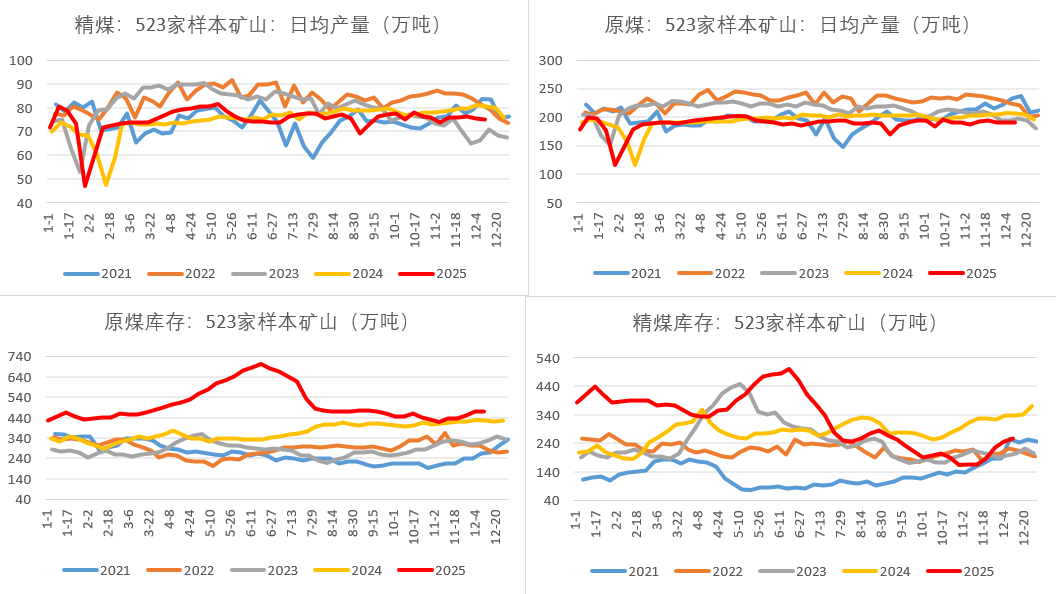 供应端的宽松预期是本轮焦煤下跌的核心驱动力。国产煤端虽维持低位运行,但已无法形成供应缺口支撑。据Mysteel调研,全国523家炼焦煤矿最新周度产量环比微降0.3%,精煤产量同比减少12%,主要受年度产量指标耗尽与安全检查的影响。截至12月10日,国内110家洗煤厂库存环比增长3.2%,供应压力持续向产业链传导。
