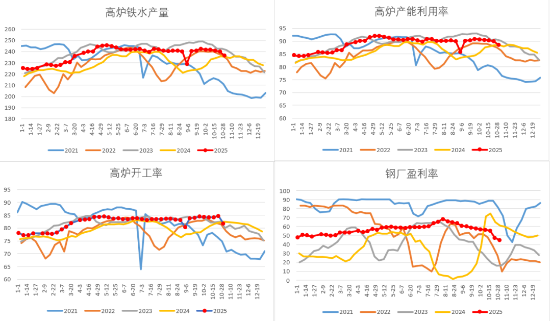 需求端的季节性萎缩则加剧了价格下行压力。作为焦煤消费的核心环节,钢铁行业正面临利润收缩与产量回落的双重挤压。截至12月12日,247家钢厂高炉开工率降至78.63%,日均铁水产量229.2万吨,较10月高点下降近12万吨,。钢厂盈利率仅35.93%,,亏损压力下检修计划密集出台,12月中下旬铁水产量或进一步降至225万吨以下。