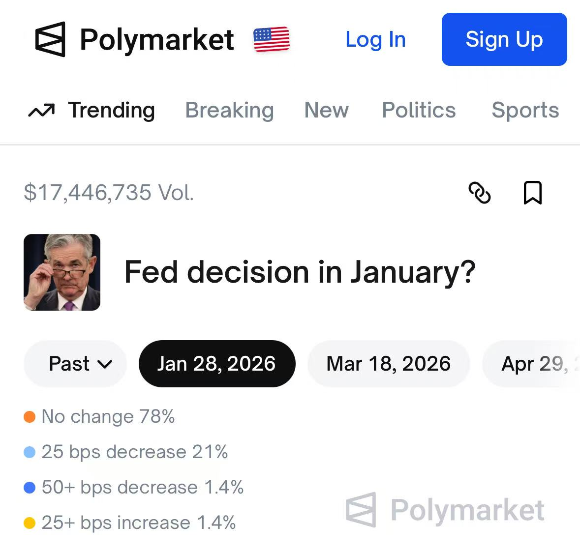 与此同时,polymarket数据显示,美联储明年1月维持利率不变的概率飙升至78%。