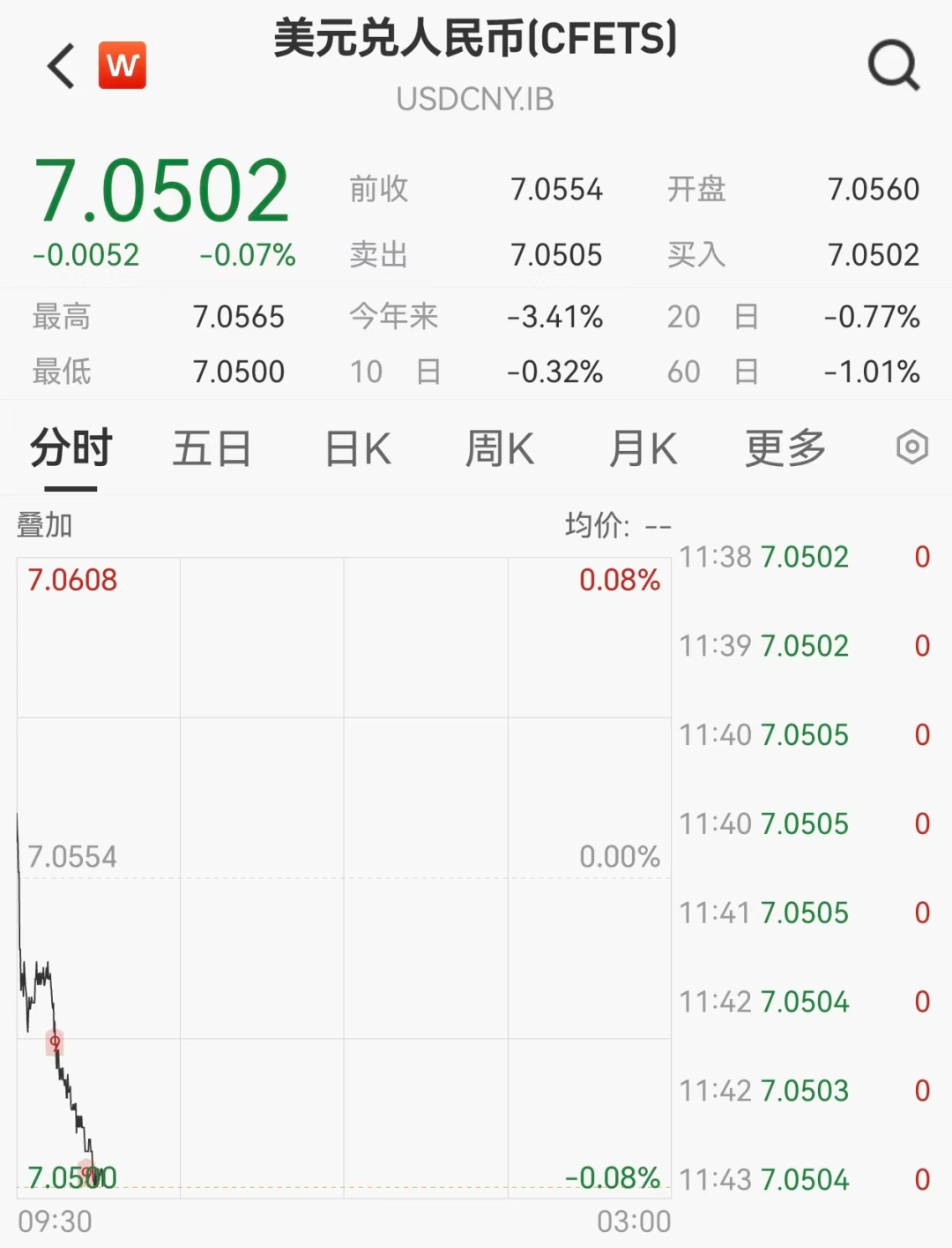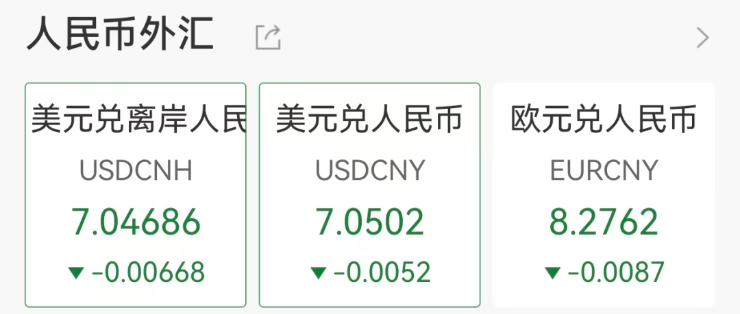 12月15日,人民币走强,截至12:00左右,在岸人民币兑美元汇率升至7.05附近,为2024年10月8日以来的最强水平;离岸人民币击穿7.05,达7.04686。