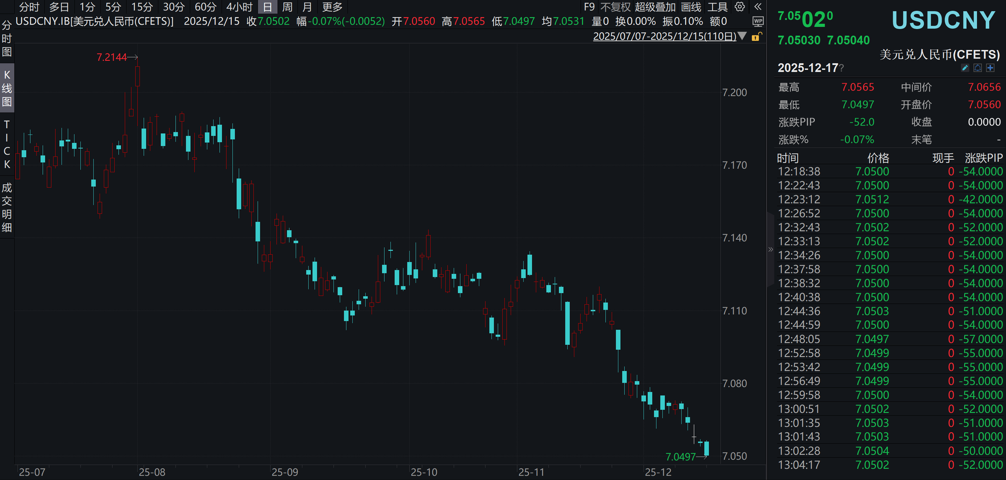 在岸、离岸人民币对美元汇率盘中升破7.05创近14个月新高