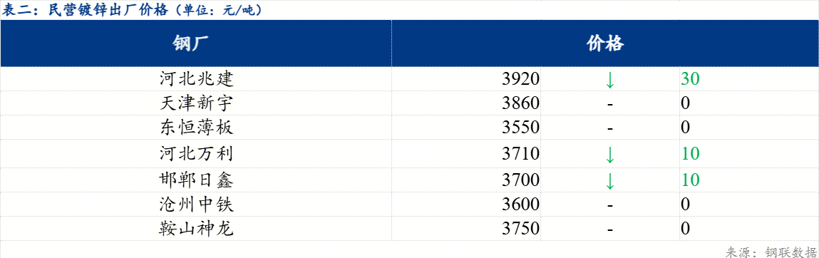 今日北方民营钢厂镀锌出厂指导价在3550-3920元/吨。