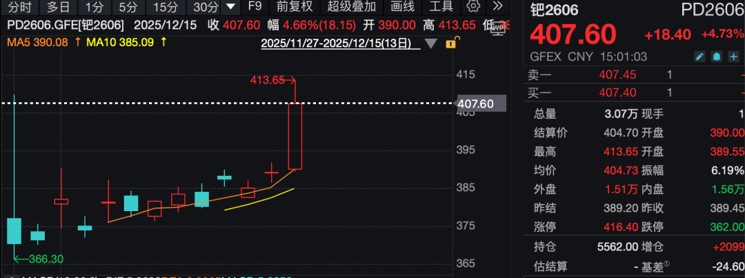 12月15日,国内期货市场铂、钯主力合约领涨。截至下午收盘,铂2606合约涨停,报涨7%;钯2606报涨4.73%。