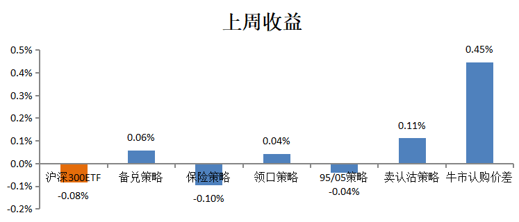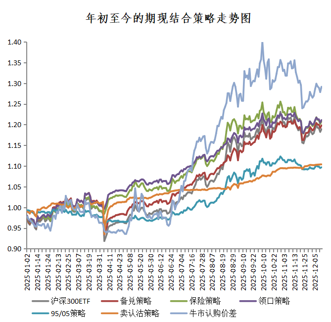我们对期现结合的六个策略(备兑、保险、领口、95/05配置、卖认沽、牛市认购价差)及沪深300ETF现货,在上周(2025.12.8-2025.12.12)的表现进行了回测。上周沪深300ETF横盘震荡,牛市认购价差策略表现相对较好,主要是由于前期现货上涨,使价差策略中卖出认购的腿已接近平值,本周该腿时间价值流逝较快,策略整体盈利。具体结果如下: