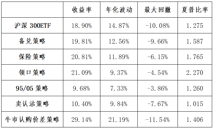 备兑、保险、领口策略建仓及调仓方法:组合基日为2024年12月31日,以收盘价买入1万份300ETF现货,备兑策略以收盘价备兑卖出开仓1张当月虚值5%的认购合约,保险策略以收盘价买入开仓1张当月虚值5%的认沽合约,领口策略以收盘价买入开仓1张当月虚值5%的认沽合约并备兑卖出开仓1张当月虚值5%的认购合约。此后在每个月期权合约到期日前一周的最后一个交易日进行调仓,以收盘价平仓已持有的期权合约,并以收盘价建仓相应的下月合约。当保险策略和领口策略所持期权收益率超过50%时,期权进行止盈平仓。