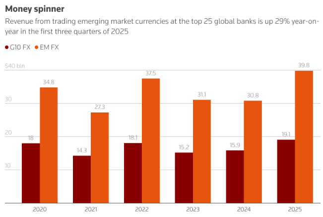 对于银行来说,交易新兴市场货币也是一项盈利丰厚的业务。据Vali Analytics数据,在前九个月里,新兴市场外汇交易业务为全球前25家大银行带来了近400亿美元的收入,这是这些银行迄今为止表现最好的一年。这一数字是这些银行从10种主要货币(包括美元、英镑和欧元等)交易中所获收入(190亿美元)的两倍多。