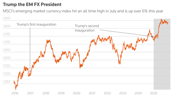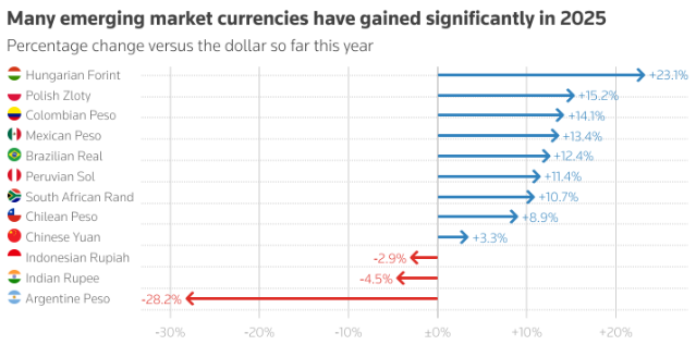 今年,福林兑美元汇率已上涨约20%,创下近25年来最佳表现,成为2025年新兴货币表现最佳的货币之一。从更广泛的层面来看,今年新兴市场货币的表现也相当不错:MSCI新兴市场货币指数在7月创下历史新高,并有望实现自2017年以来的最佳年度表现,涨幅超过6%。接受机构调查的交易员、基金经理和分析师大多预计这一趋势明年也将持续下去。