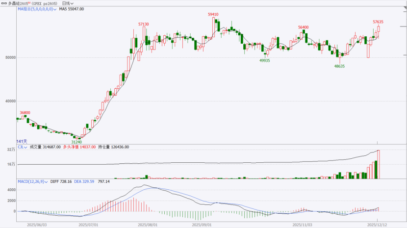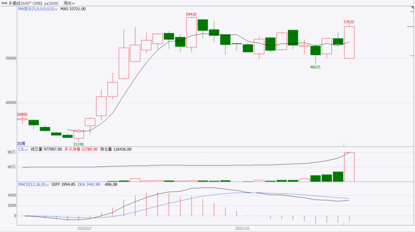 上周(2025.12.08-12.12),多晶硅ps2605收于57190元/吨,较前一交易周上涨3390元/吨。成交量为977907手,持仓量为126435手。