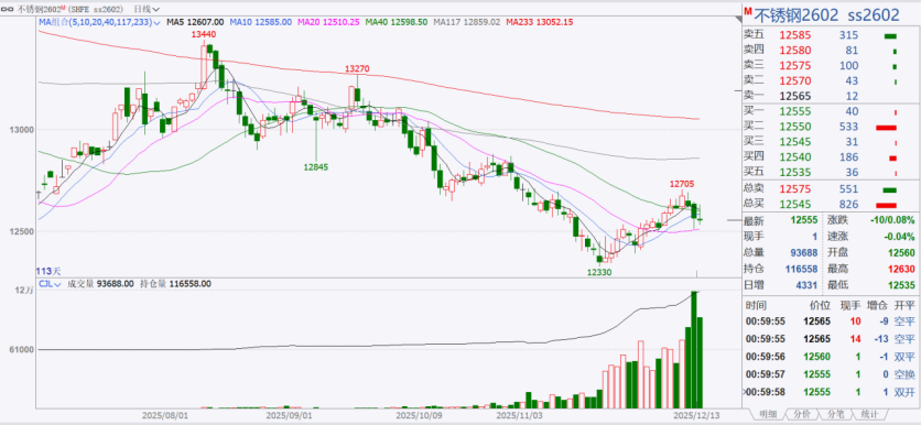 上周(2025.12.08-12.12)不锈钢主力合约2602合约,上周开盘12590点,周最高12705点,周最低12515点,截至周五收盘,报12565点,较上一周下跌了25点,跌幅0.20%。成交量38.2万手,较上一周增加了11.7万手,持仓量11.2万手,较上一周增加了27885手。
