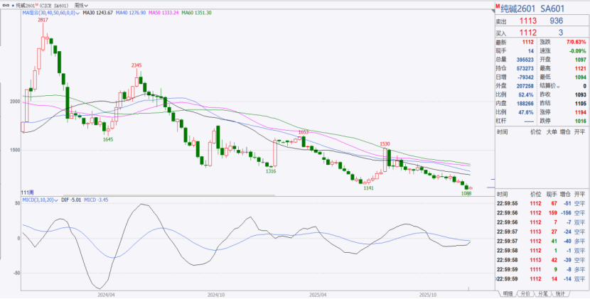 上周(2025.12.08-12.12)纯碱期货2601(SA601)合约周开盘价1133元/吨,最高价1152元/吨,最低价1088元/吨,收盘价1093元/吨,周成交量368.4万手,持仓量65.3万手。
