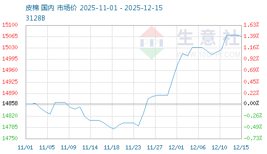 近期国内棉价重心上移,宏观面上延续宽松基调,扩内需政策持续强化;下游存在刚性补库需求。据生意社商品行情分析系统,截至12月15日3128B级皮棉现货价格在15068元/吨,周涨幅为0.30%。期货方面,截至12月15日,郑棉主力合约结算价13915元/吨,周度上涨180元/吨。国际棉价维持弱势下行,ICE期棉主力合约周均结算价63.89美分/磅,较前一周均结算价下跌0.44美分/磅,跌幅0.7%。