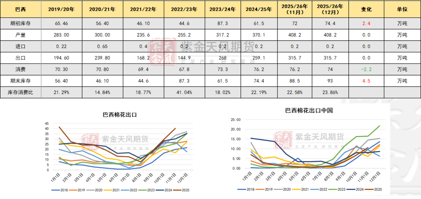 USDA12月月报下调巴西棉25/26年度消费2.2万吨,受期初库存调增2.4万吨影响,最终期末库存上调4.5万吨,影响中性偏空。