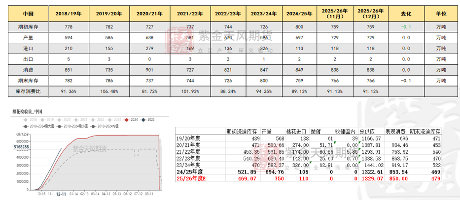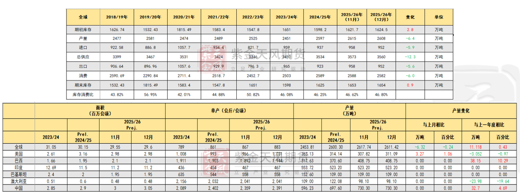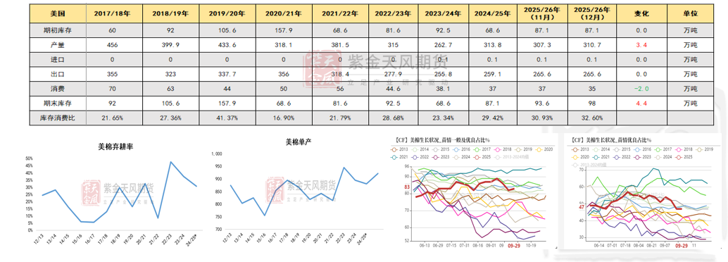 新年度种植预期:偏空 12月报告中,2025/26年度全球棉花供需平衡表显示,全球棉花产量、消费量及贸易量均小幅下降,期末库存则有所增加,影响中性偏空。美棉产量小幅调整,影响中性。