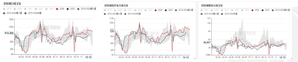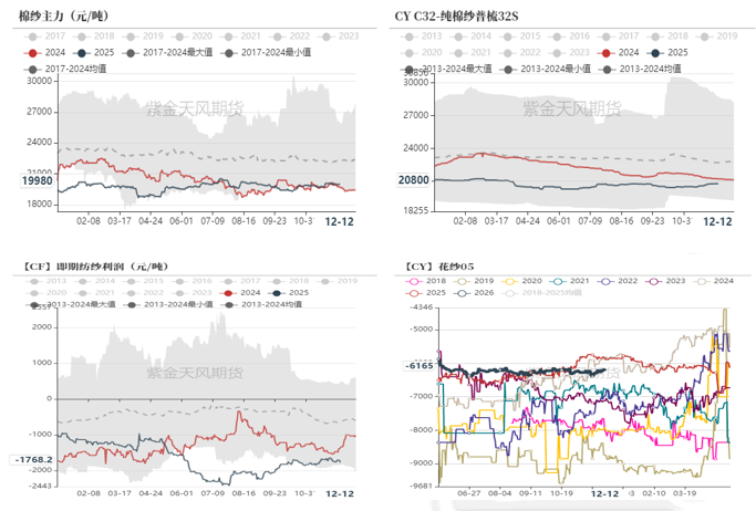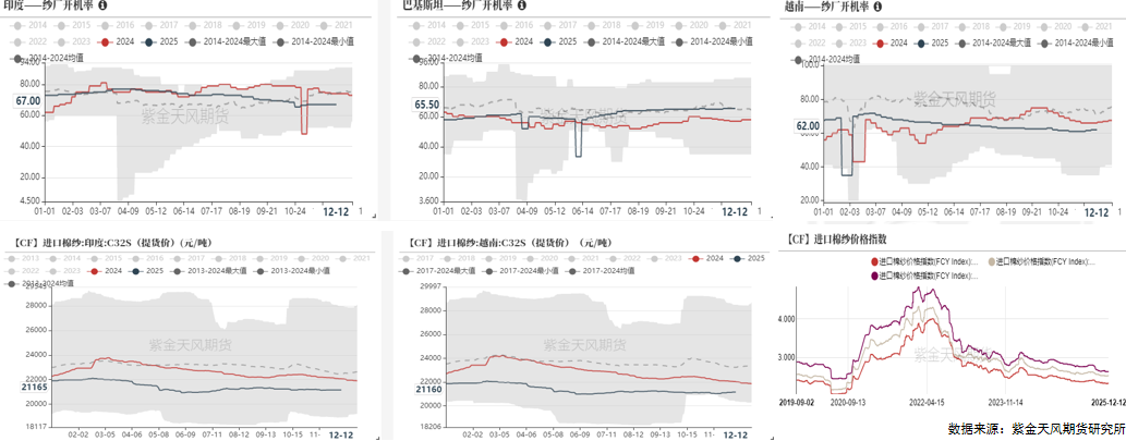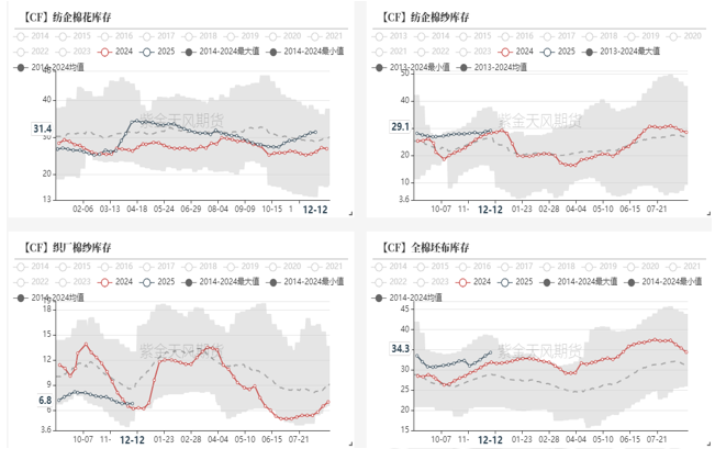截至12月15日,纺纱厂原料库存为31.4天,边际补库。成品库存29.1天,小幅累库。织布厂棉纱库存为6.8天,原料库存偏低,织布厂全棉坯布成品库存34.3天,小幅累库。