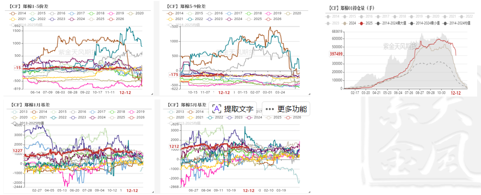 现货:中性 现货交投一般,纺企刚需采购维持,2025/26南疆机采3130/30B/杂3.5内主流销售基差多在CF01+1000及以上,少量在850-950区间,疆内自提。