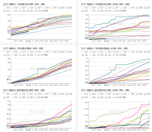 截止11月13日当周,2025/26美陆地棉周度签约4.26万吨,环比降36%,较四周平均水平增10%,同比增22%,其中越南签约1.49万吨,土耳其1.36万吨;2026/27年度美陆地棉周度签约0.04万吨;
