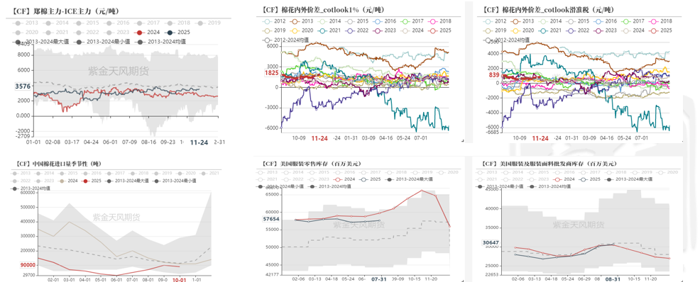 全球终端消费:中性 美国服装及服装面料批发商库存小幅补库,但零售商去库为主(中性),我国棉纺出口东南亚及欧美日韩份额维持,关税影响较小(偏多)。出口市场拓展非洲、俄罗斯、拉丁美洲等(偏多)。
