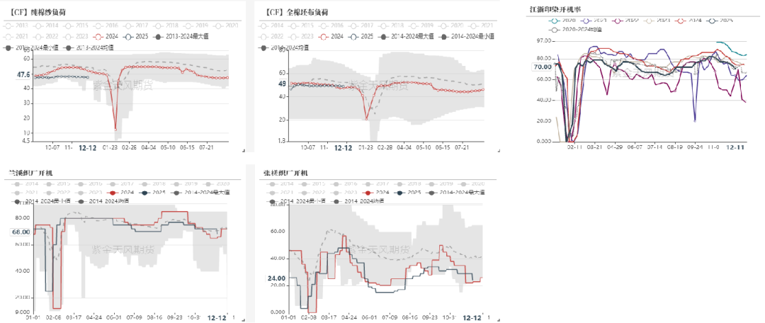 截至12月15日,棉纱厂开机负荷为47.6%。织厂整体开机率在49%,开机维持。